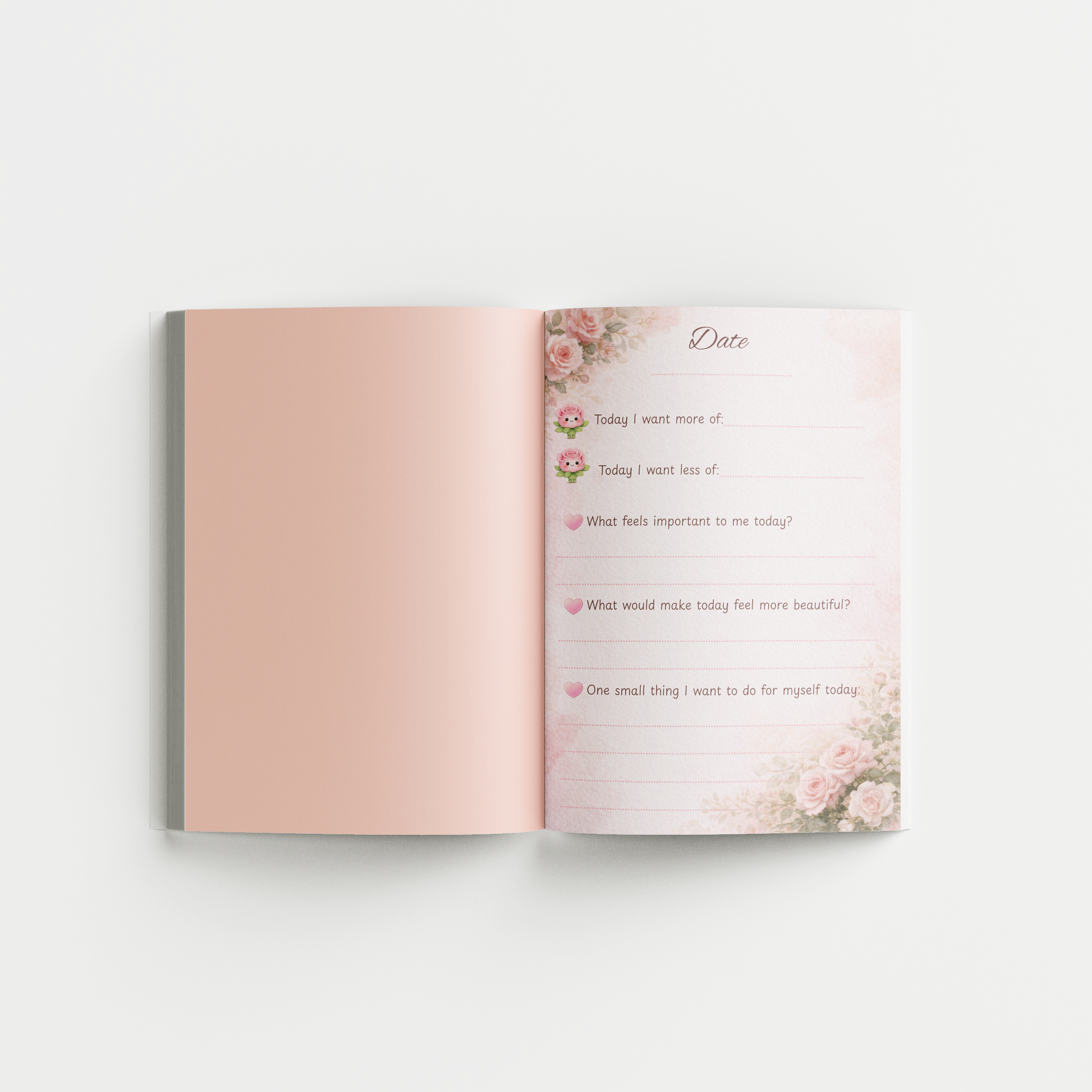Inside, you will find repeated guided pages with prompts such as what you want more of, what you want less of, what feels important today, what you want to make space for, and simple reminders for yourself. The layout is designed to feel feminine, calming, and easy to use, with enough writing space to make each page personal.
